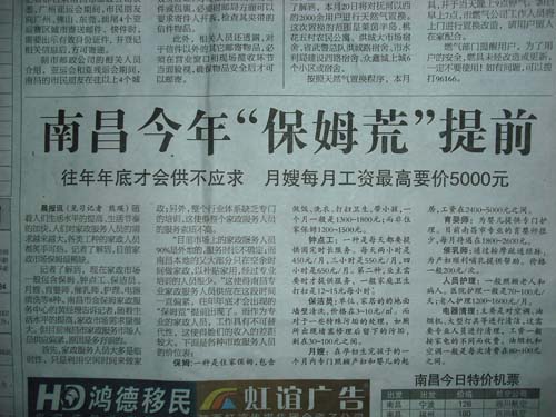 記者了解到,現(xiàn)在家政市場一般包含保姆、鐘點(diǎn)工、保潔員、月嫂、育嬰師、催乳師、護(hù)理、電器清洗等8種。南昌市金保姆家政服務(wù)中心的黃經(jīng)理告訴記者,隨著生活水平的提高,家政市場需求量很大。但目前南昌市家政服務(wù)市場人員供應(yīng)偏緊,原因是多方面的。